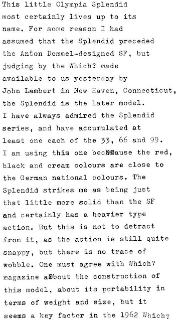Thank you Bill, Scott and Richard for your comment. Yes, Splendid in all regards. Big confession, Scott, I put the black ribbon spool cover from a non-working machine on the otherwise all-bright red beautifully working Splendid 99. But I was thinking of Germany, not Essendon! Ah, Richard, yes: I always think of the Kolibri as West Germany - all because of that blasted movie The Lives of Others. You pointed out at the time that it was odd to have an East Germany machine smuggled over the border from the West - and that the Stasi wouldn't have a Groma finger(type)print.