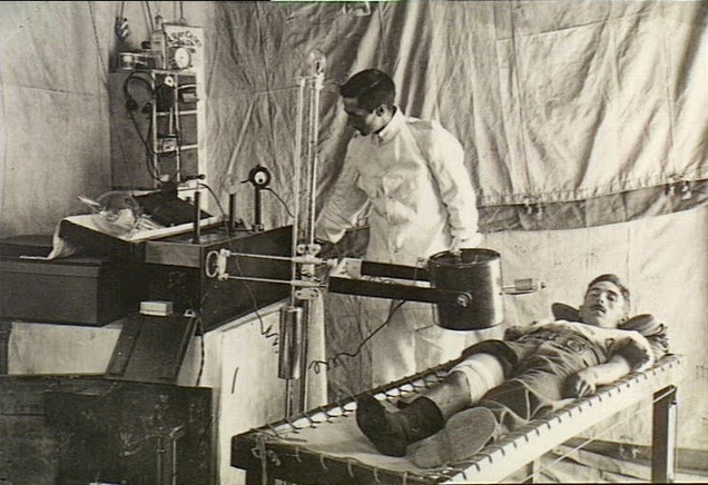 performing an X-ray on a soldier in the 1st Australian Stationary Hospital at Moúdros. The X-ray was to determine the