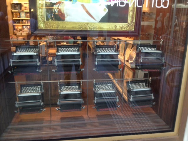 Typewriter-collecting encourager and cricket lover Peter Crossing made an 11th hour decision to go to the World Cup one-day semi-final between Australia and India in Sydney last week, after being offered a ticket by an Adelaide friend. Peter seldom fails to spot typewriters on any of his travels (Washington, Barbados, Hanoi), or to take photographs of same. This display he found at an art supply shop called Type in an arcade near the corner of George and Liverpool streets. These are, of course, grossly overpriced tinplate typewriters, not the Real McCoy.