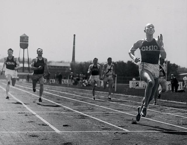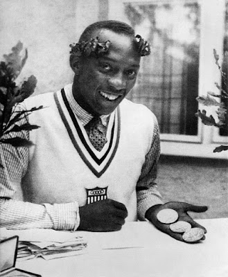 I was in Herman Price's office on Greenbag Road, Morgantown, West Virginia, when I got talking to another renowned typewriter collector, Mike Campbell (above, right, with Herman at his desk). Mike told me he came from Ann Arbor, Michigan, and I immediately remarked that that was where Jesse Owens had broken five world records and equalled another world record within 45 minutes on one afternoon, on May 25, 1935. I'm not sure if Mike knew that, but Richard Polt, who was within earshot, seemed surprised I could recite such details off the top of my head. Yet Jesse Owens' efforts in Ann Arbor were so astonishing that, once absorbed by a young track nut in 1959, they would remain forever deeply etched on his mind.