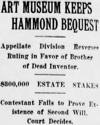 The Appellate Division decided in May 1914 that the Hammonds, given their agreement with the Metropolitan Museum of Art, could make no further efforts to interfere with James B. Hammond's will - that is, to try to get their grubby little hands on the typewriter money. Nonetheless, in March 1915 the youngest sister, Mary Elizabeth Hammond Hardy, of Dallas, Texas, was encouraged by Charles Nash Hammond's son James Bartlett Hammond Jr (1890-), who was not an "heir-at-law" (as his father was still alive), to make yet another attempt to revive the "Lopez will". The case was reopened by Justice Emory Albert Chase (1854-1924) of the New York Court of Appeals on September 27, 1915, and decided on October 29.