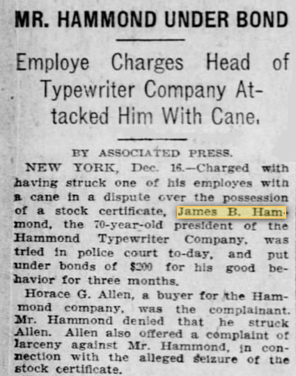 Horace Greeley Allen (1873-), a bookkeeper with the Hammond company, gained James W. Davis' five shares as Davis' executor. When James Hammond called Allen to his office on December 9, 1908, allegedly raised his cane, called Allen a "dog", threatened to bury him and demanded the shares be returned, Allen pressed charges. As well as pursuing $10,000 in damages for assault, humiliation and other perceived hurts, Allen maintained Hammond was guilty of larceny for not returning to Allen the five Davis stock certificates that Hammond had snatched from him.