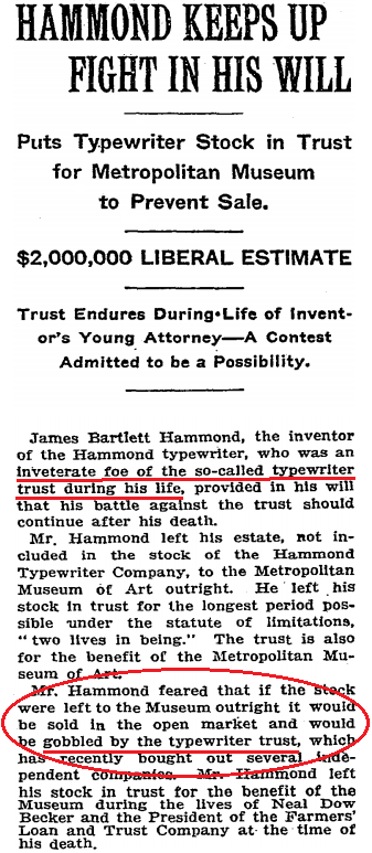 As The New York Times reported on February 2, 1913, a week after Hammond's sudden death, Hammond had been an "inveterate foe" of the trust and believed it might "gobble up" his company: