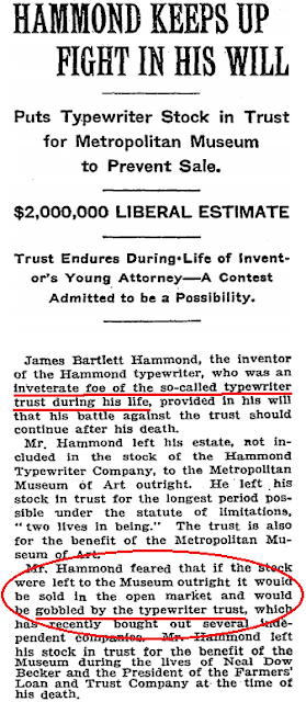 With Thomas F. Hammond now cast out of the "family loop", this second unsuccessful bid by the heirs for the Hammond typewriter fortune was guided by another of James Bartlett Hammond's brothers, Charles Nash Hammond (1859-), a Broadway taxidermist and furrier and a millionaire businessman in his own right. And if Thomas F. Hammond's failed 1907 "insanity plot" had made the family look like mealy-mouthed money-grubbers, Charles Hammond's plan revealed them to be downright untrustworthy. But his nasty scheme at least proved somewhat easier to disprove.