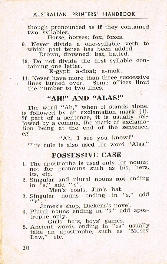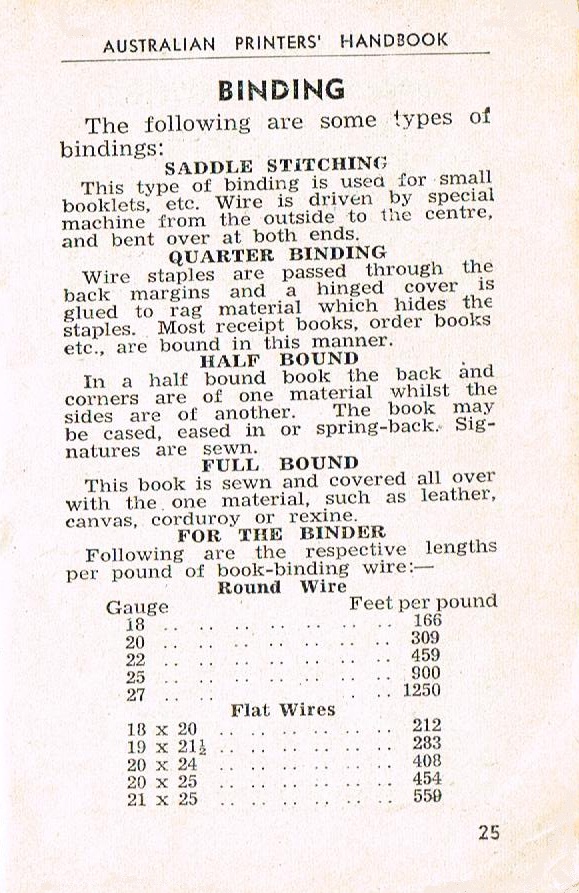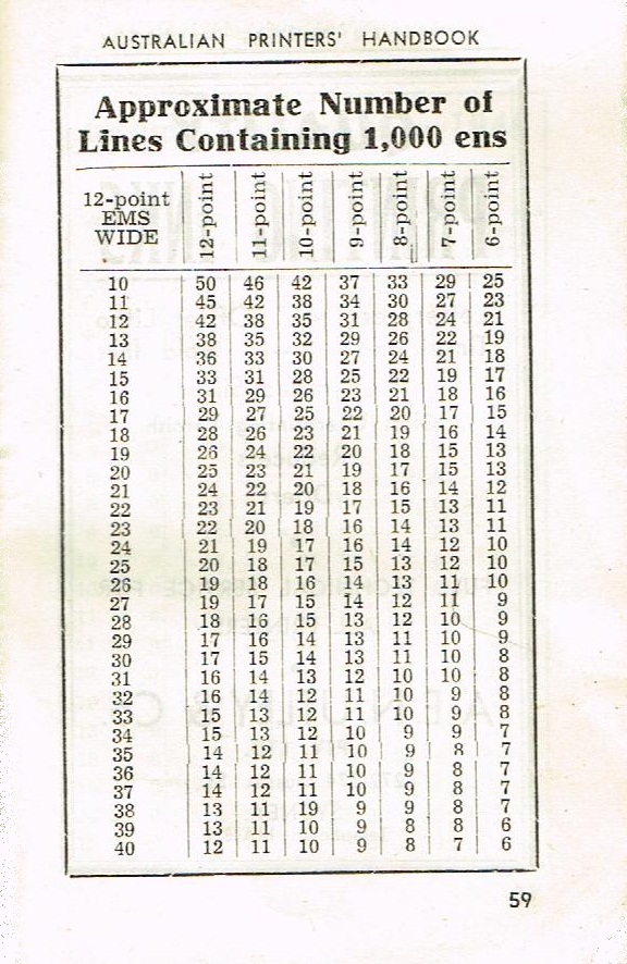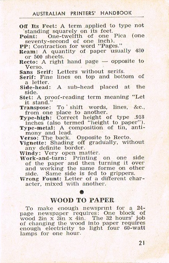 There seems to be quite a bit of interest out there in the Typosphere about old-style printing and publishing - the terminology, the technology and the history (so pleased that printers were expected to know a little about the history of their craft). For the benefit of those interested in this lost art, I have scanned in most of the pages of The Australian Printers' Handbook of 1950, compiled by E.C. Bennett, as I think it contains a lot of very useful information. I have left out the section on Impositions, so if anyone particularly wants that part, please let me know: