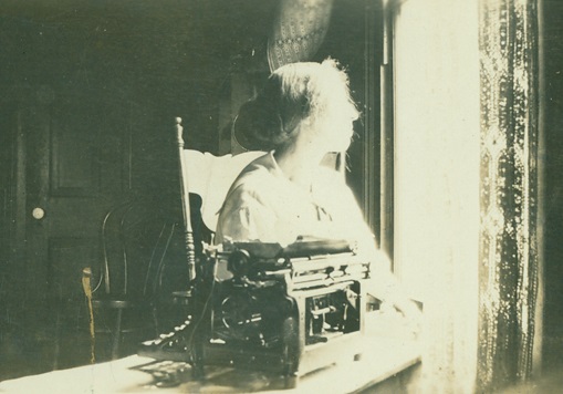 Lola Ridge at her typewriter. Below, her typescript of "Firehead".