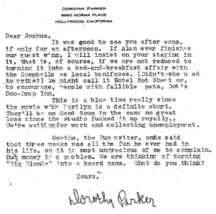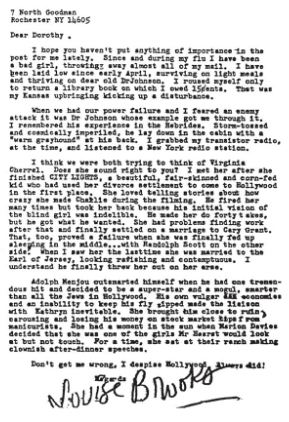 Astonishingly, Israel-McCarthy's first "bogus billet" is actually a postscript McCarthy types on to the bottom of what is supposed to an actual Brice letter. It reads, “My new grandchild has inherited my old nose. Should I leave something extra for repairs?” So the gormless mark is not supposed to be able to tell the difference between words typed on a manual typewriter sometime before 1951 (when Brice died; I think the letter is actually dated 1942) and a PS written on an electric portable typewriter (which didn't appear before 1957)? Someone has to be kidding, surely? After all, the real Israel was clearly very resourceful, and to a large degree the movie reflects this. At least Dorothy Parker lived to see the advent of electric portables, though not the Electra 210 (the Tytells would have seized on that in seconds, at one quick glance):