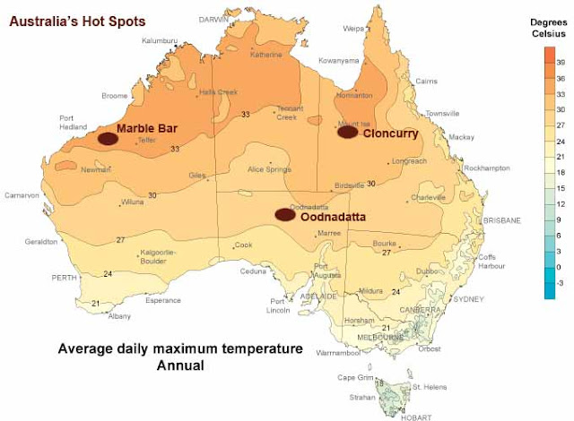 Today the town of Marble Bar in far north Western Australia (above) is very much in the news. It reached a temperature of 120.2 degrees Fahrenheit (49 Celsius). Tomorrow it will be 118.4 (48). This is how one of Australia's four major television networks plans to cover this newsworthy event, according to a post on Marble Bar's Facebook page: