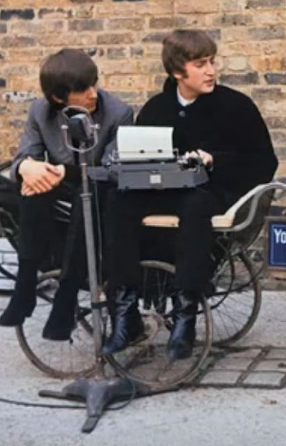 George Harrison and The Beatles' press officer, "Sergeant" Derek Taylor, at a Litton Industries, Japanese-made Imperial Model 80 typewriter at the 94 Baker Street, London, offices of Abbey Corps in 1968.