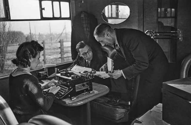 journalists typing their stories are covering a wedding on June 3, 1937, at the